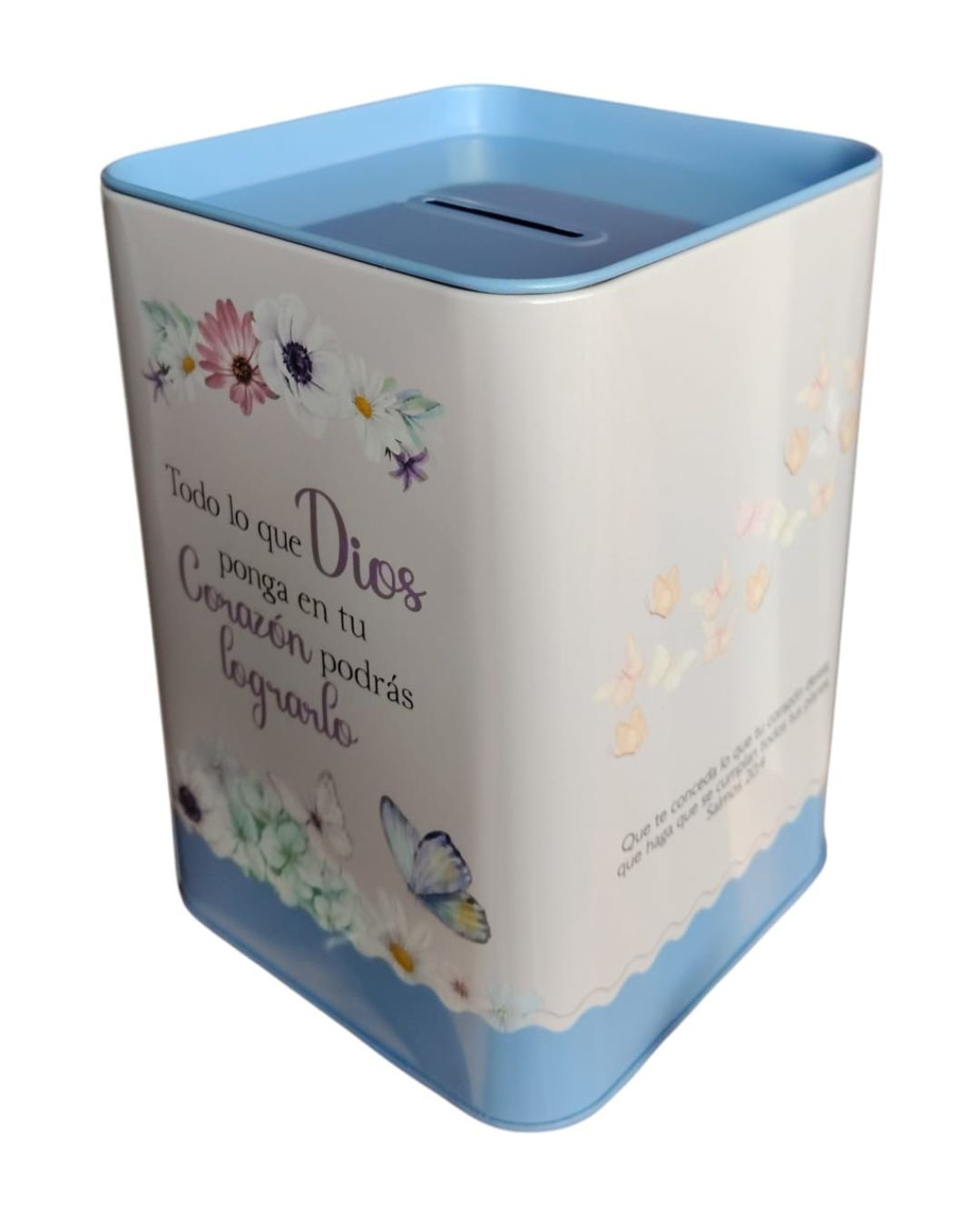 Alcancía cristiana decorativa con frase inspiradora, ideal para recordar que Dios guía nuestros sueños y propósitos. Este hermoso cofre de ahorro presenta un diseño delicado con flores y mariposas, acompañado del mensaje: “Todo lo que Dios ponga en tu corazón podrás lograrlo”, una frase que inspira fe, esperanza y perseverancia.