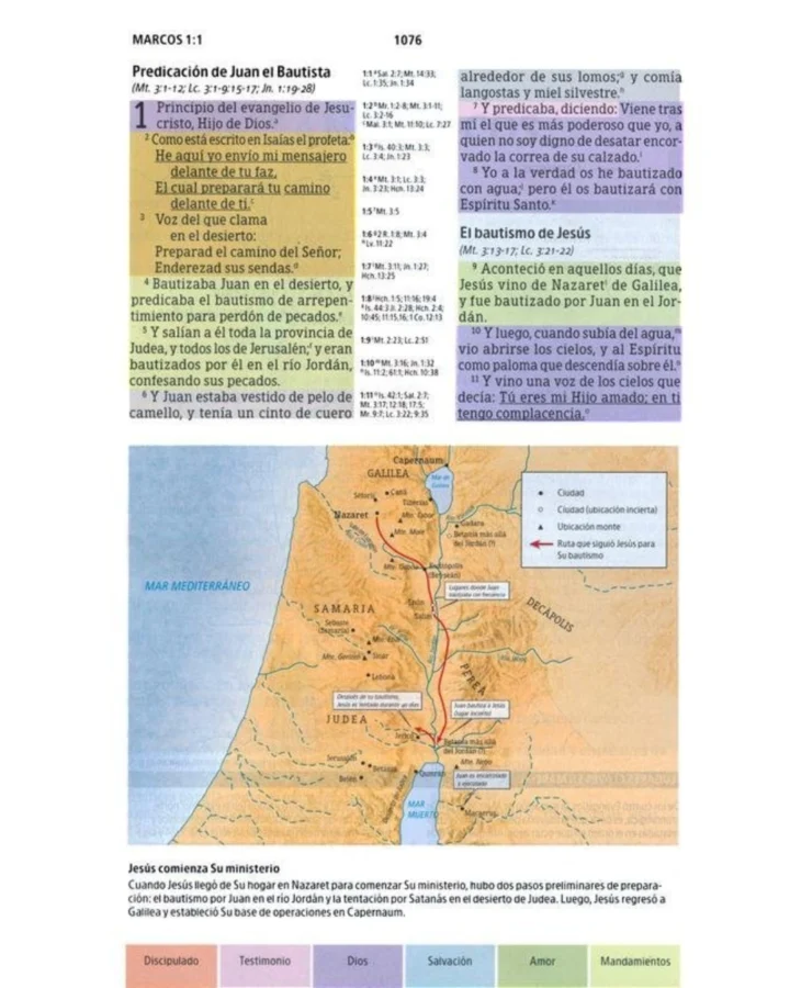 - Cada versículo en su propio color de acuerdo con 12 temas clave