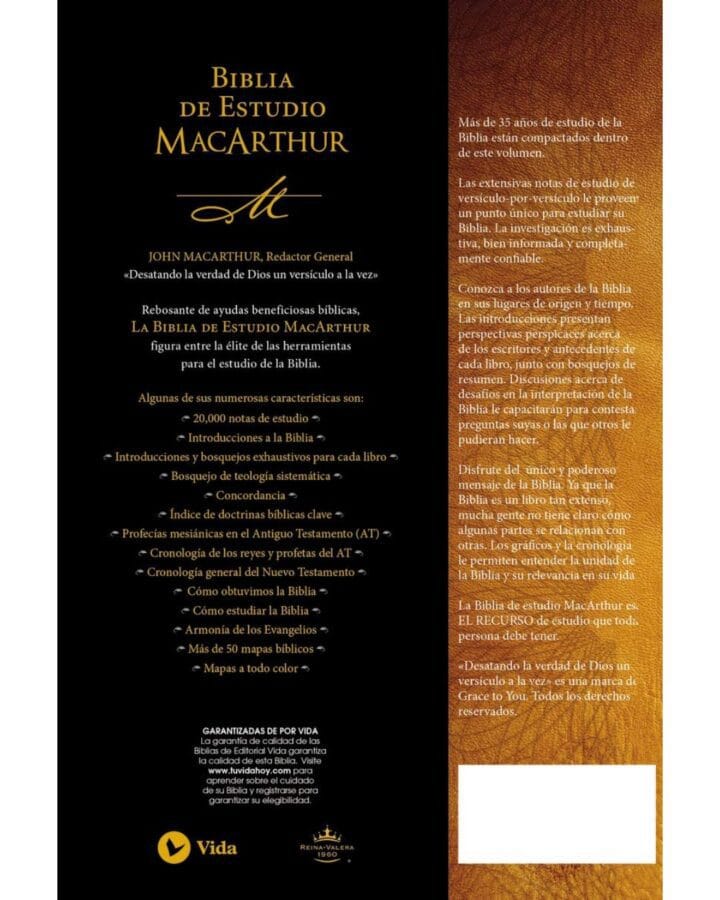 El conocido pastor John MacArthur ofrece a través de esta Biblia, más de 20,000 notas de estudio personal, producto de 40 años de investigación exegética y de interpretación, con la finalidad de aclarar pasajes complejos, explicar a detalle y con fundamento, palabras que son de interés en el área teológica.