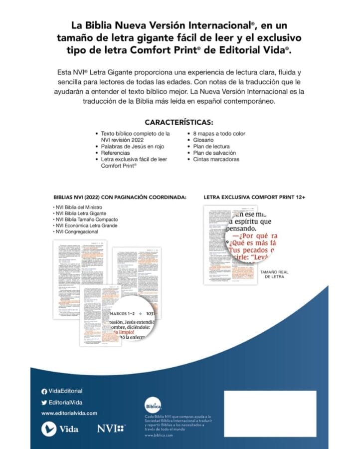 Con un tamaño de letra gigante y fácil de leer y el exclusivo tipo de letra NVI Comfort Print ®, la Biblia NVI Letra Gigante proporciona una experiencia de lectura clara, suave y fácil para lectores de todas las edades. El sistema de referencias al final de los párrafos le permite cruzar fácilmente los versículos de las Escrituras.