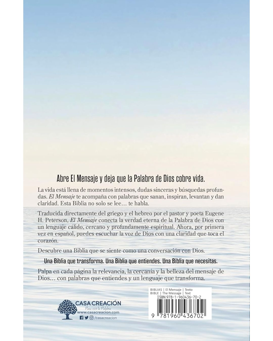 El Mensaje es la traducción al español de The Message, realizada directamente del hebreo y el griego por el pastor y poeta Eugene H. Peterson. Esta versión presenta la verdad eterna de la Escritura con un lenguaje actual, cercano y profundamente espiritual, facilitando una comprensión clara y natural del texto bíblico.