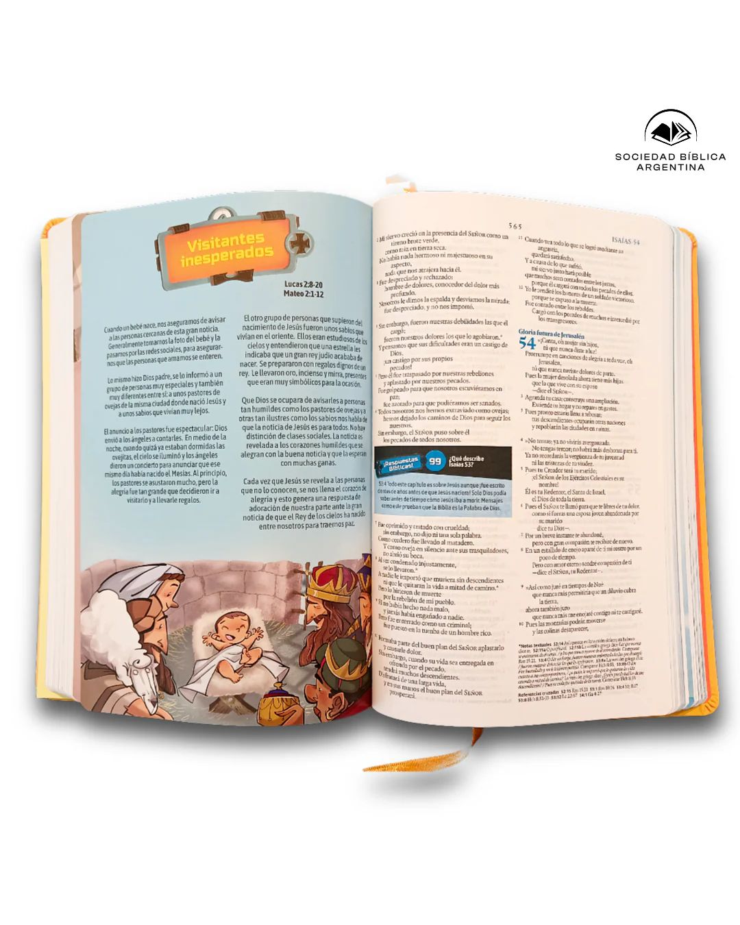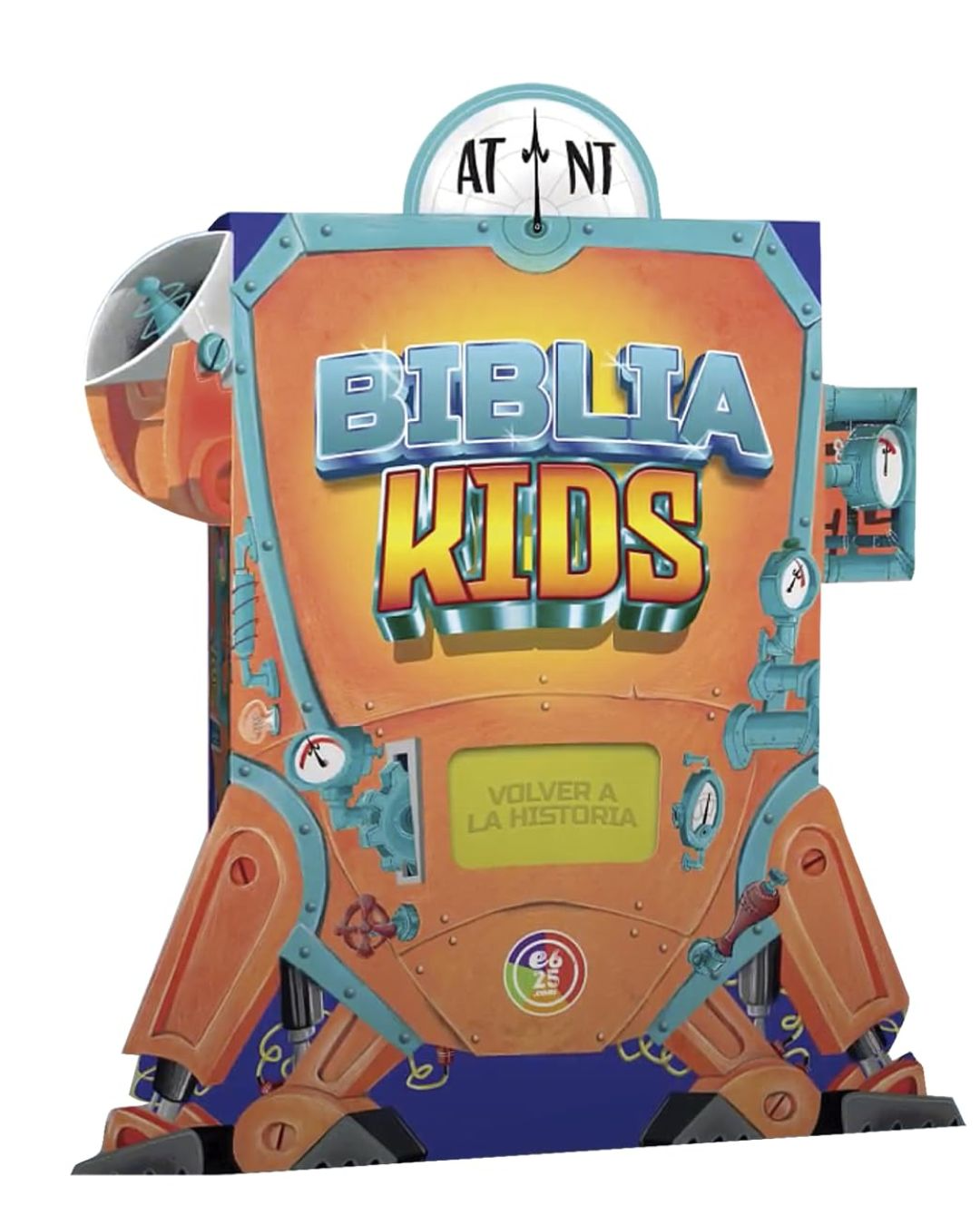 Esta Biblia destaca por su caja interactiva que se transforma en una “máquina del tiempo”, invitando a los niños a sumergirse en las grandes aventuras desde Génesis hasta Apocalipsis. Cada libro bíblico incluye introducciones explicativas que ayudan a los pequeños a entender el propósito y mensaje central de cada parte de la Escritura.