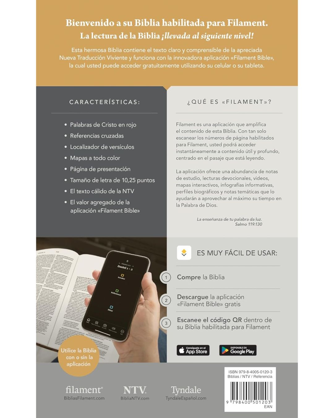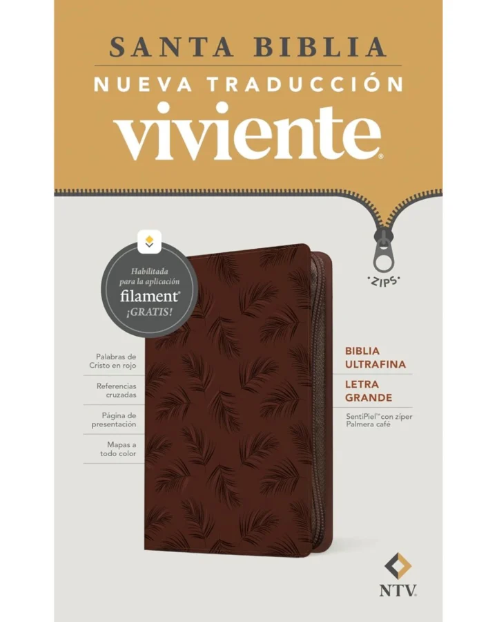 La nueva Biblia ultrafina NTV, letra grande de zíper con Filament ofrece un texto legible de 10,25 puntos, un diseño atractivo, referencias cruzadas, las palabras de Cristo en rojo, una página de presentación y mapas a todo color: todo en una Biblia delgada y fácil de transportar. La Biblia ultrafina NTV, letra grande de zíper ofrece mucho más que una típica Biblia de texto, gracias a la innovadora aplicación «Filament Bible».