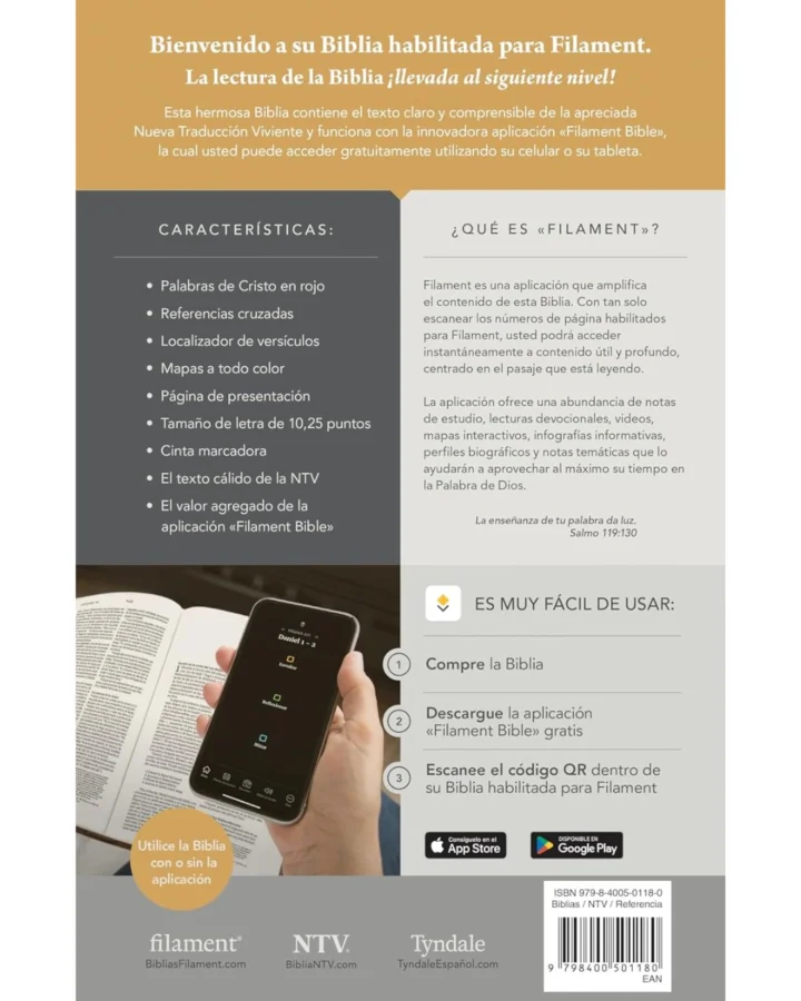 La Biblia valor prémium NTV, letra grande con Filament es la Biblia perfecta para leer y disfrutar la Palabra de Dios, ya que ofrece un tamaño de letra muy cómodo, además de un precio accesible. Esta Biblia es atractiva, portátil, fácil de leer y tiene la confiable y muy querida Nueva Traducción Viviente (NTV). También está habilitada con la innovadora aplicación «Filament Bible», que provee una gran cantidad de contenido adicional electrónico relacionado con cada página.