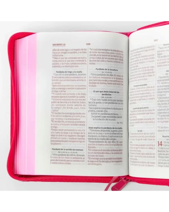 Una Biblia con un diseño juvenil, con un tamaño mediano, en su interior podrá encontrar la Palabra Dios con una fuente mucho más grande para su cómoda lectura, pequeñas notas explicativas de algunos términos importantes, palabras de Jesús resaltadas, ayudas que te permitirán más el uso de esta Biblia en tus tiempo de oración y estudio.