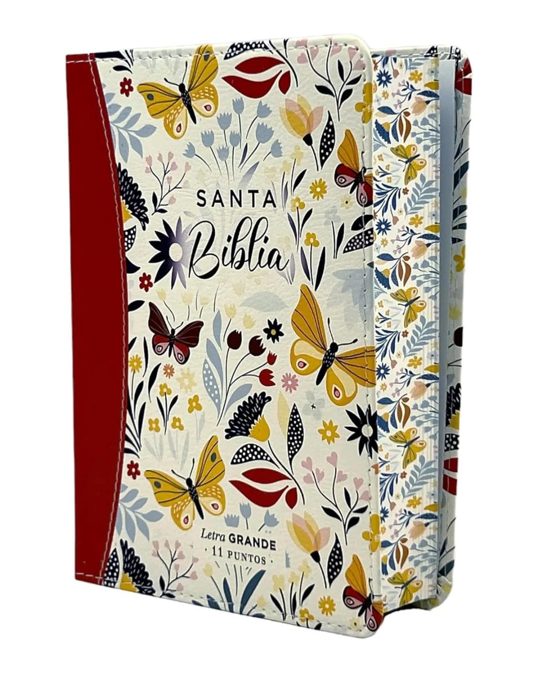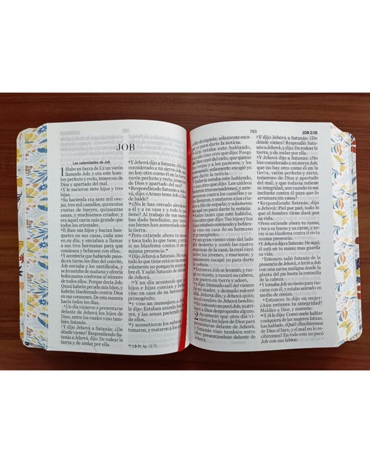 Reina Valera 1960, tamaño portátil (110×165 mm), imitación piel impresa, con canto pintado, palabras de Jesús en rojo, concordancia amplia , Concordancia de personajes bíblicos. ayudas, referencias cruzadas. 32 páginas a todo color con ayudas y esquemas. 12 mapas a todo color .Letra 11 puntos.