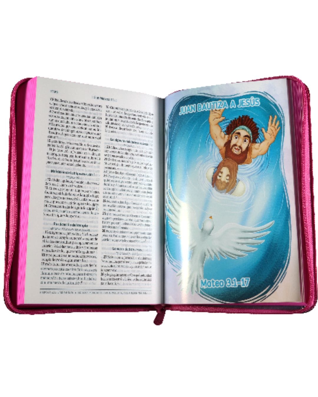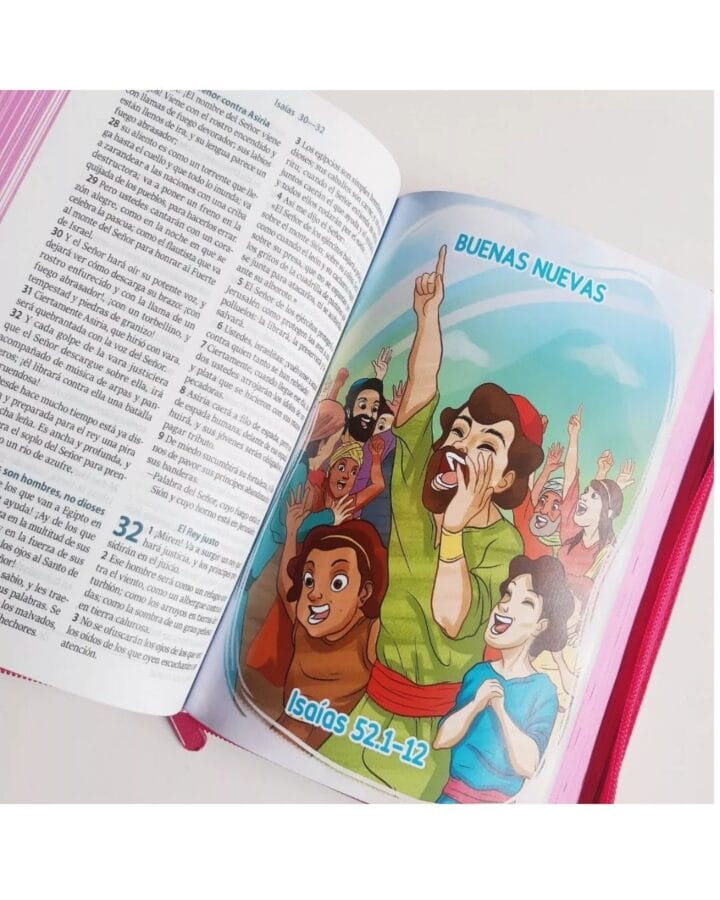 - 44 divertidas láminas a todo color, intercaladas en el texto bíblico.