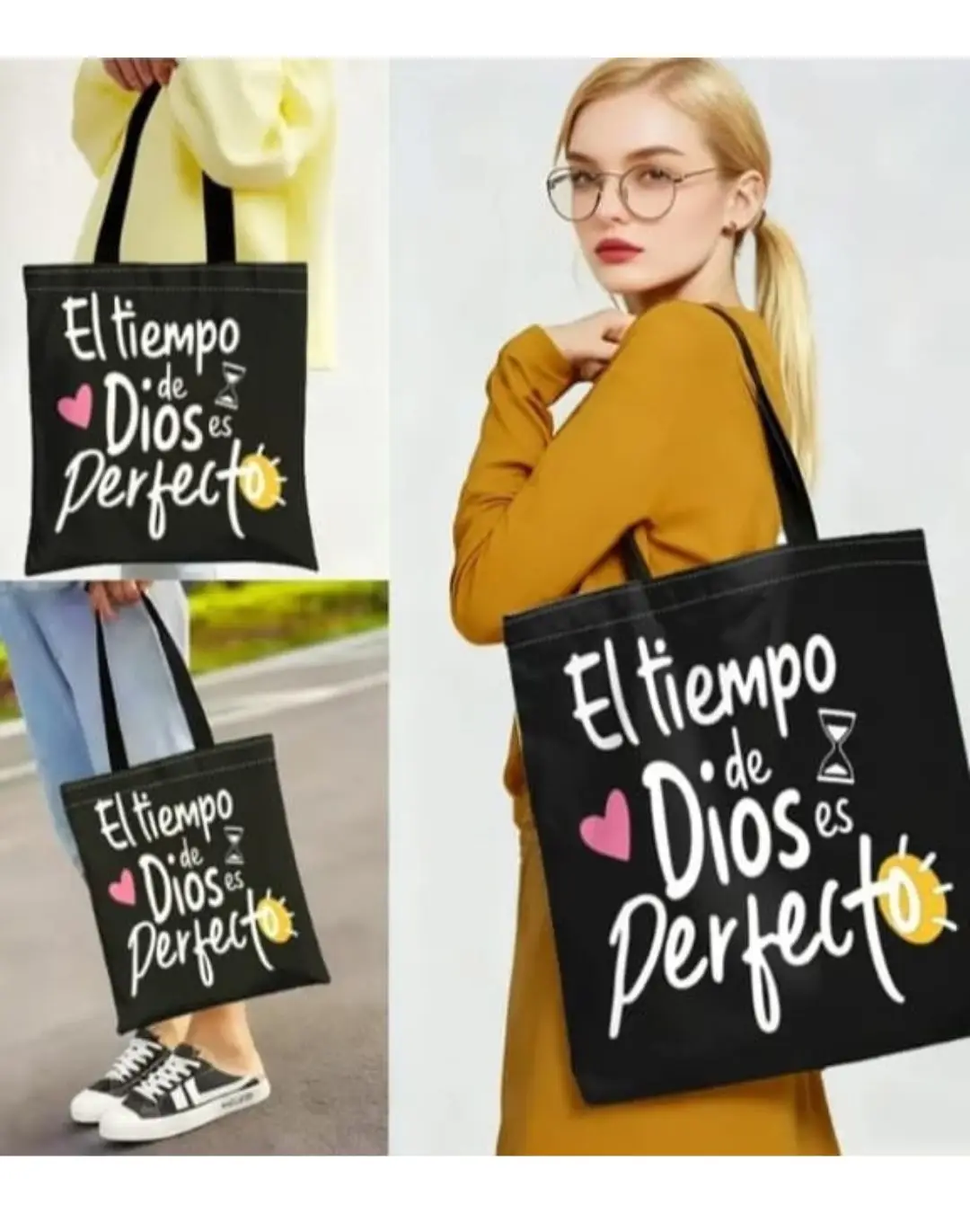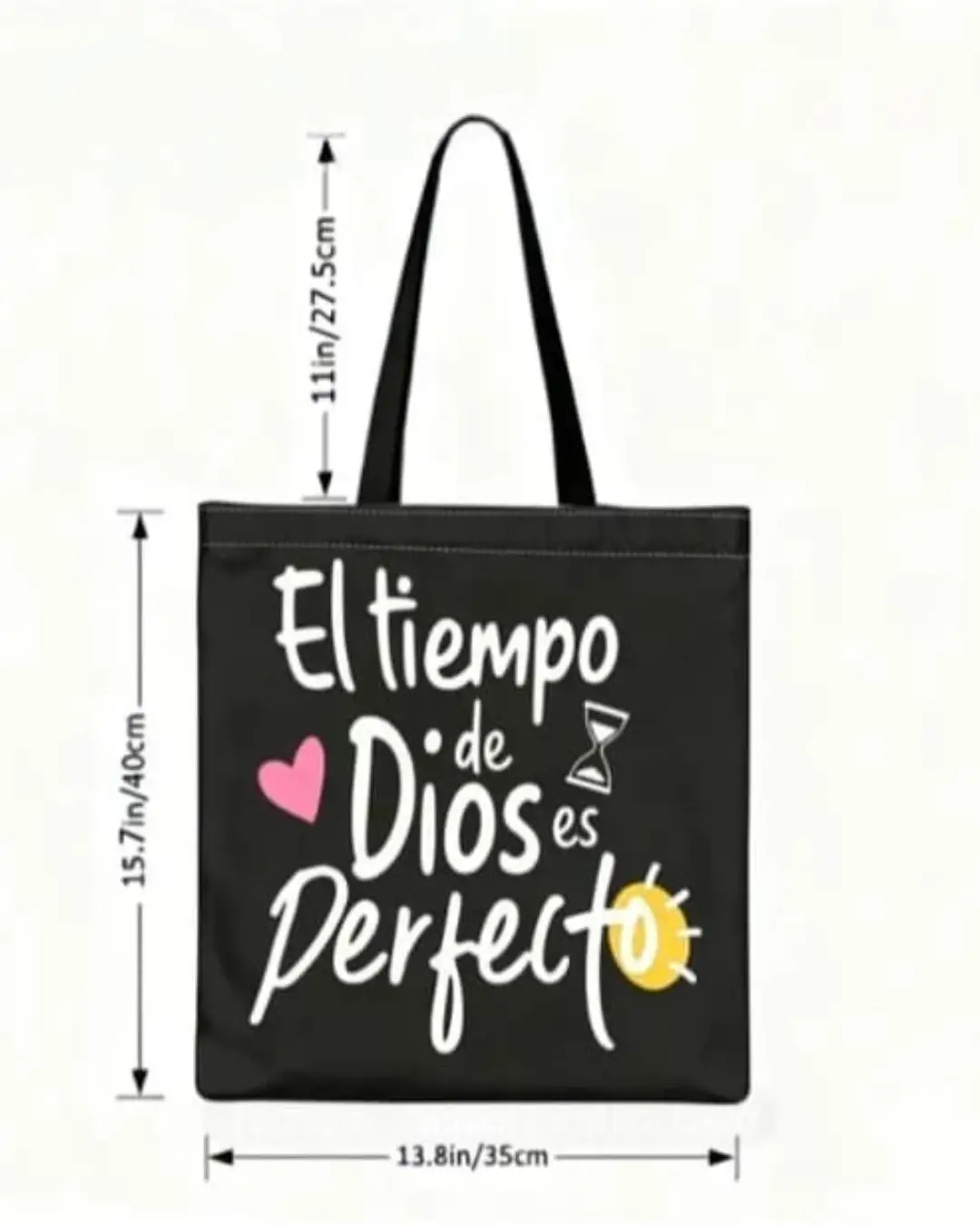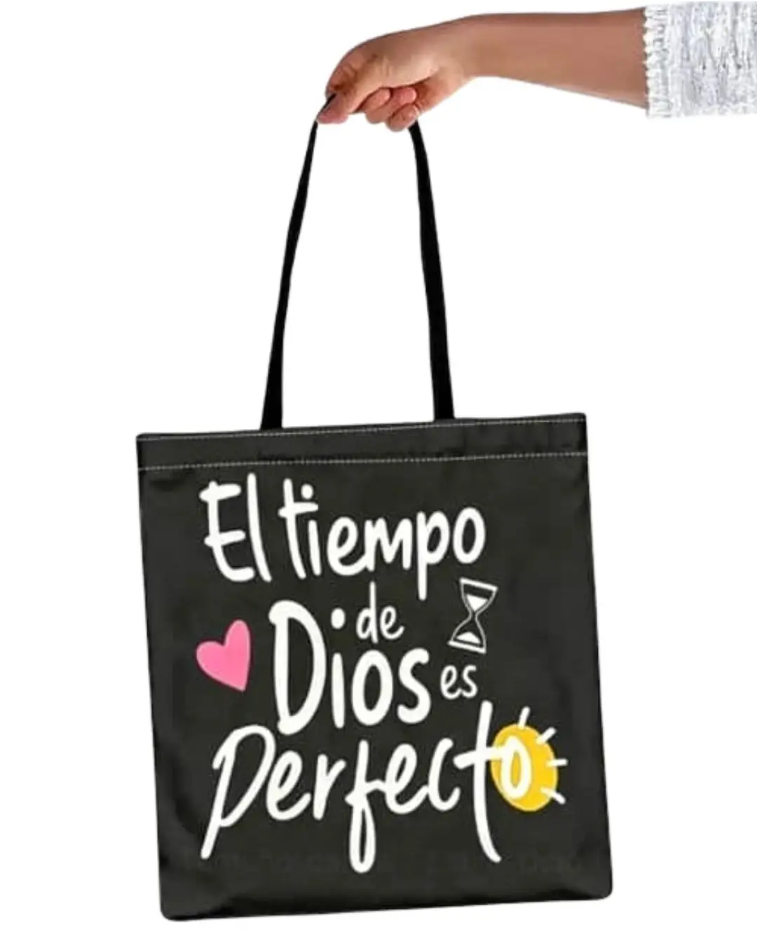 Lleva contigo un mensaje de fe y esperanza con esta hermosa bolsa tote cristiana con la frase “El tiempo de Dios es perfecto”. Su diseño moderno en color negro con tipografía estilo manuscrita y detalles decorativos la convierten en un accesorio práctico y significativo para el día a día.