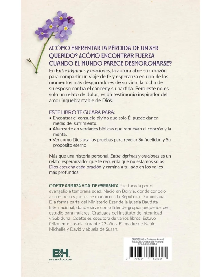 ¿Cómo enfrentarte a la pérdida de la persona que amas? ¿Cómo hallar fuerzas cuando la vida parece romperse en mil pedazos? En Entre lágrimas y oraciones, la autora comparte su experiencia de fe y esperanza en medio de uno de los momentos más difíciles de su vida: la batalla contra el cáncer de su esposo y su partida. Pero esta no es solo una historia de dolor; es un testimonio poderoso del amor de un Dios que sostiene y transforma en medio del dolor.